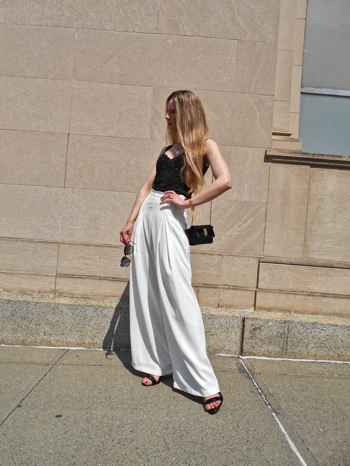 Black blazer: Ralph Lauren (Similar), White wide leg pants: Similar (Also love these), Black beaded top: Ralph Lauren (Also love this), Black patent sandals: Schutz, Purse: Ferragamo